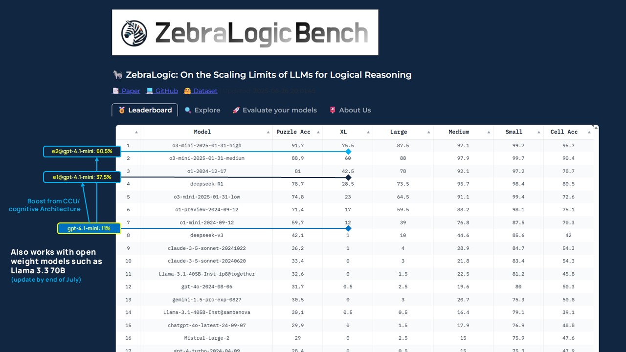 • das Basismodell (gpt-4.1-mini) erreicht ohne kognitive Architektur eine XL-Puzzle Accuracy von 11 %.
