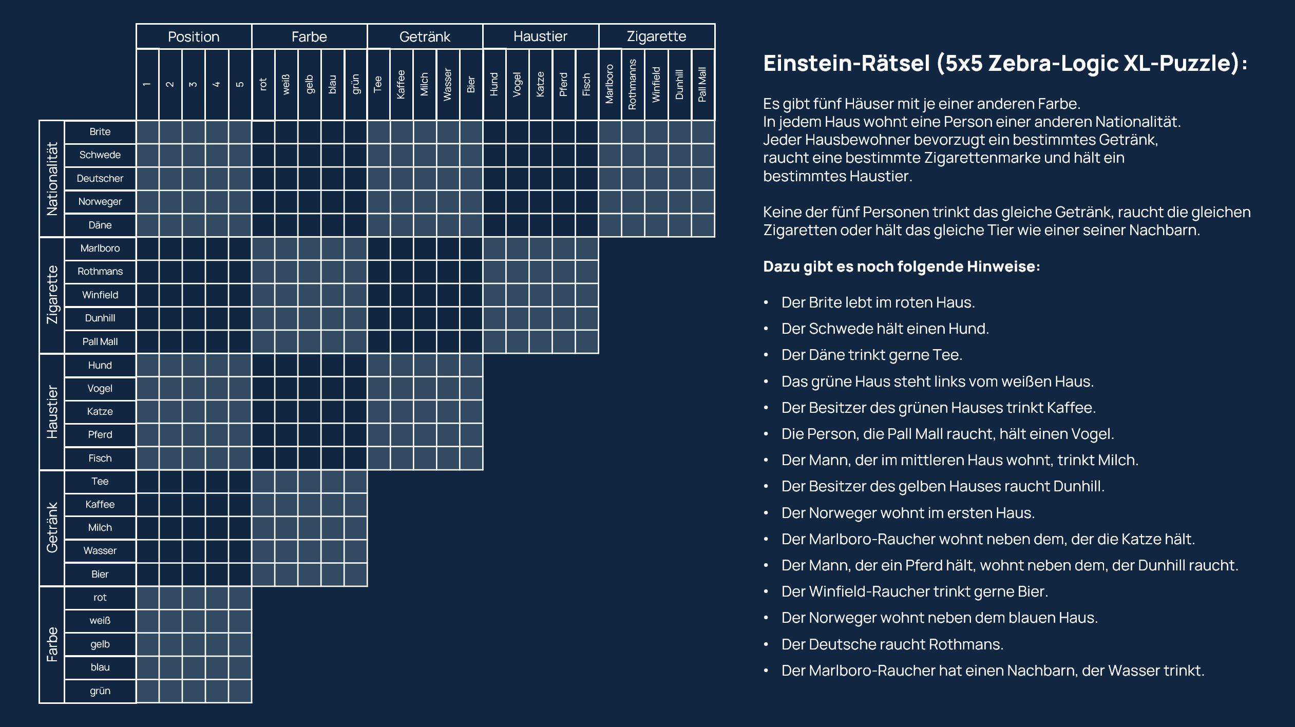 Diese Aufgaben folgen dem gleichen Prinzip wie das bekannte Einstein-Rätsel (auch „Zebra-Puzzle“ genannt), bei dem Personen mit unterschiedlichen Eigenschaften verschiedenen Häusern zugeordnet werden. Zu Illustrationszwecken ist dieses Einstein-Rätsel nachfolgend dargestellt: