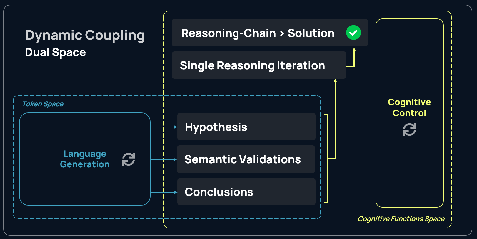 Um diese Limitierung zu überwinden, ergänzen wir einen zweiten, übergeordneten Repräsentationsraum. Dieser Dual-Space Ansatz ermöglicht eine Strukturierung und Stabilisierung langer Gedankenketten — und hebt die Fähigkeit von KI, strukturierte Denk-Arbeit zu leisten, auf eine neue Stufe.